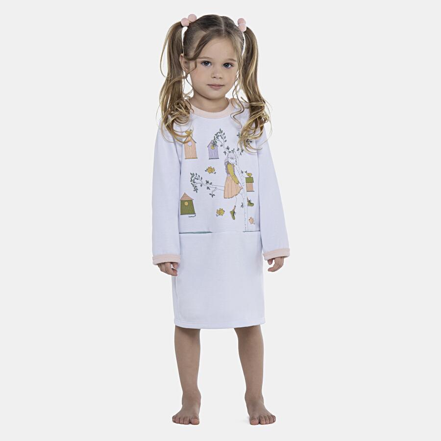 Camisão manga longa com bolsos e estampa local na parte frontal e detalhe em viés no decote, tic-tac na gola para facilitar o vestir, confeccionado em moletinho peluciado 50% algodão e 50% poliéster.