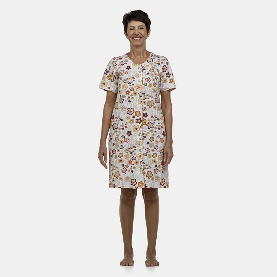 Camisola manga curta com abertura frontal e fechamento em botões em tecido com estampa corrida, confeccionada em tecido meia-malha 100% algodão.