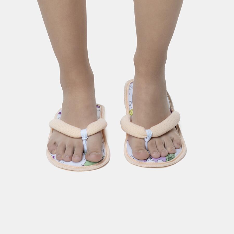 Chinelo com tiras, confeccionado em tecido meia-malha 100% algodão com estampa corrida, enchimento 100% poliéster e sola em EVA.