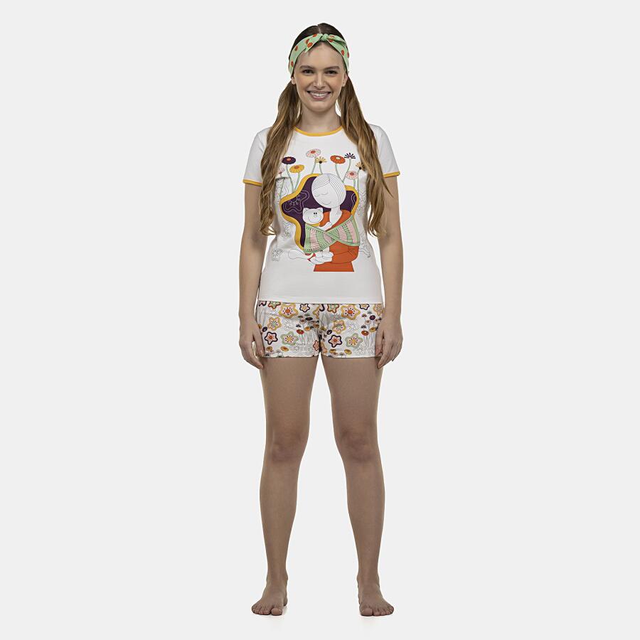 Conjunto pijama manga curta baby-look com estampa local em tecido cotton (96% algodão e 4% elastano) e short com estampa corrida, confeccionado em tecido meia-malha 100% algodão.