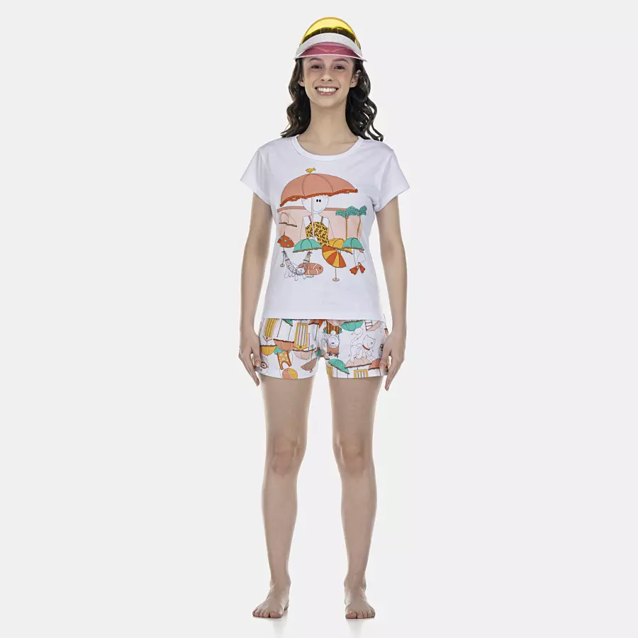 Conjunto pijama manga curta baby-look com estampa local em tecido cotton (96% algodão e 4% elastano) e short com estampa corrida, confeccionado em tecido meia-malha 100% algodão.
