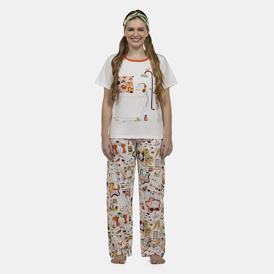 Conjunto pijama manga curta com estampa local e detalhe em viés e calça com estampa corrida, confeccionados em tecido meia-malha 100% algodão.