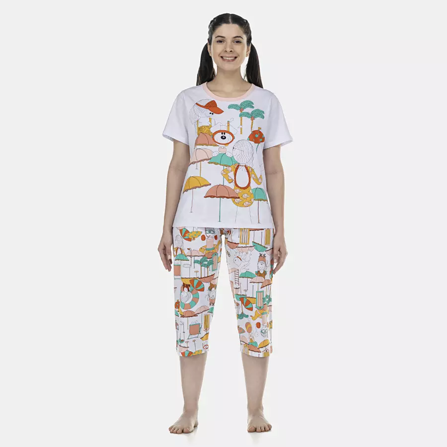 Conjunto pijama manga curta com estampa local e detalhe em viés na gola e corsário com estampa corrida, confeccionados em tecido meia-malha 100% algodão.