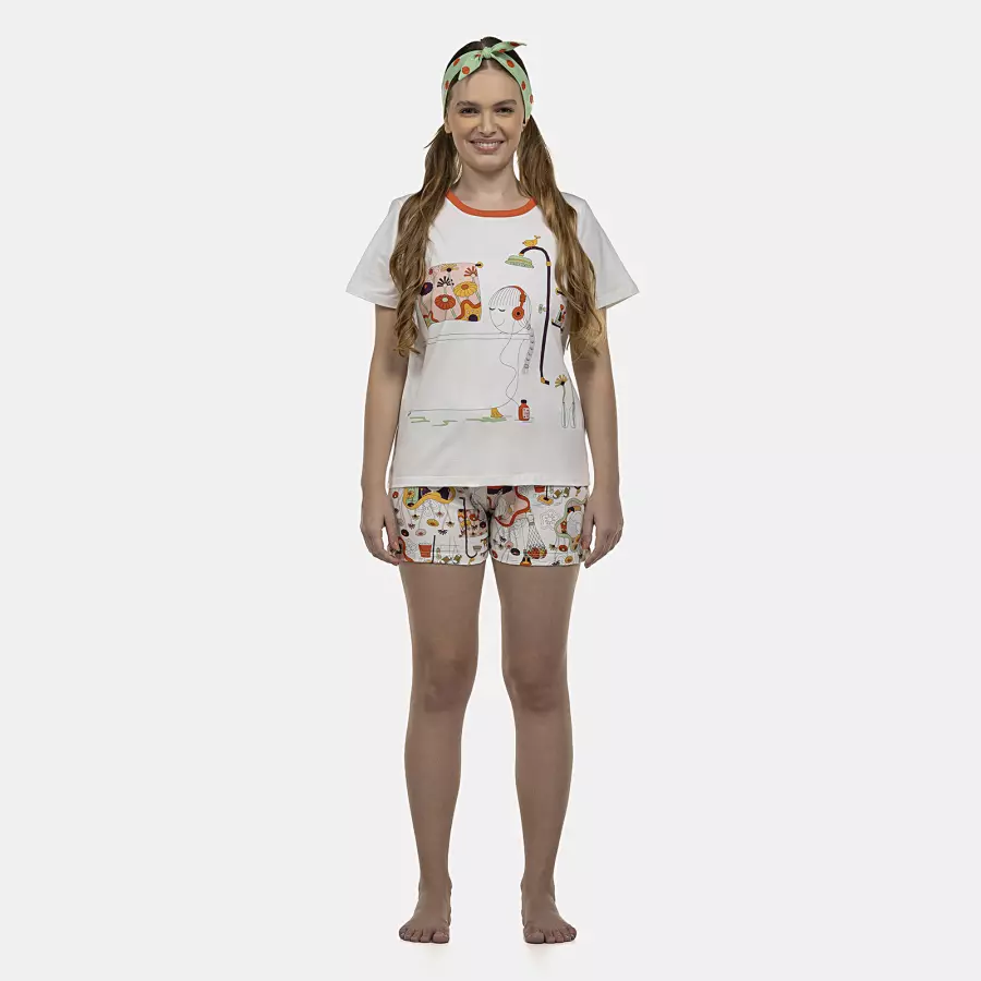 Conjunto pijama manga curta com estampa local e viés e short com estampa corrida, confeccionados em tecido meia-malha 100% algodão.