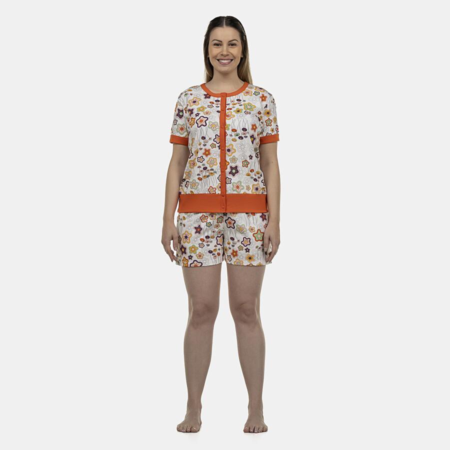 Conjunto pijama manga curta com botão e viés e short com estampa corrida, confeccionados em tecido meia-malha 100% algodão.