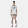 Conjunto pijama manga curta com estampa local e detalhe em viés e short com estampa corrida, confeccionados em tecido meia-malha 100% algodão.
