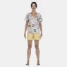 Conjunto pijama manga curta com estampa corrida, decote em V e detalhe em viés na gola e short em tecido colorido liso, confeccionados em tecido meia-malha 100% algodão.