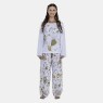 Conjunto pijama manga longa com estampa local e detalhe em viés e calça com estampa corrida, confeccionados em tecido meia-malha 100% algodão.