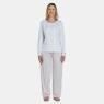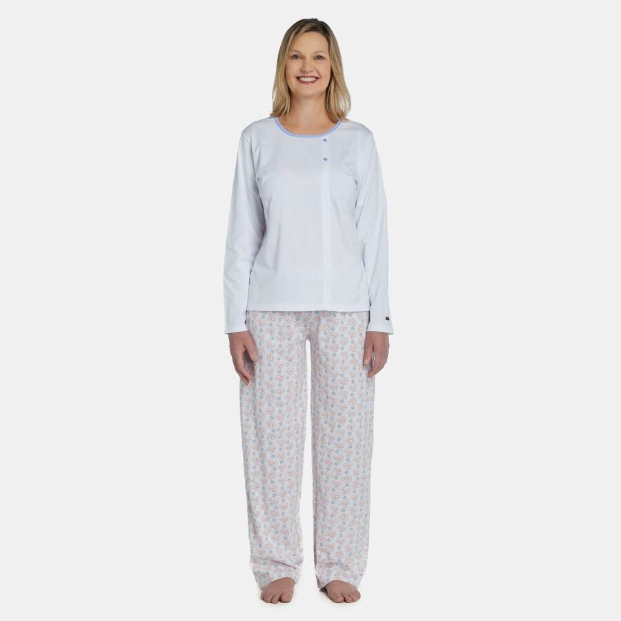 Conjunto pijama manga longa com detalhe em viés e aplique de botões e calça com estampa corrida, confeccionados em tecido meia-malha 100% algodão.
