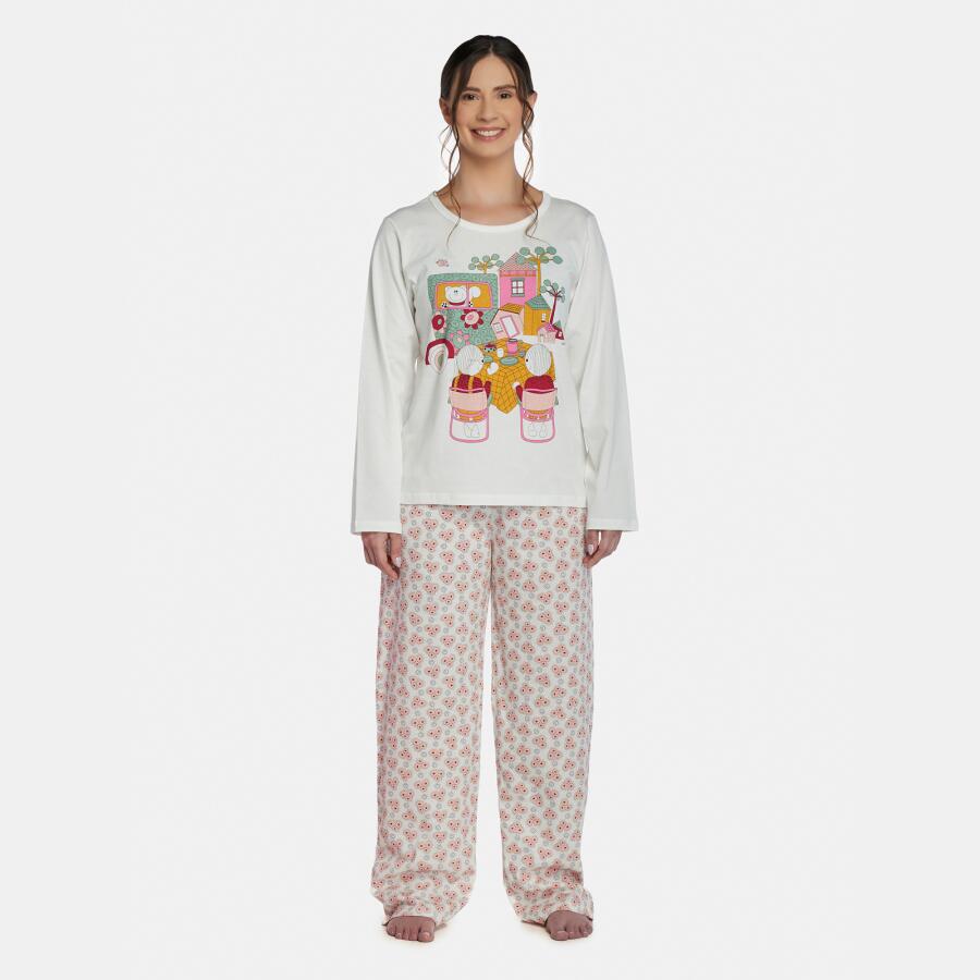 Conjunto pijama manga longa com estampa local e calça com estampa corrida, confeccionados em tecido meia-malha 100% algodão.
