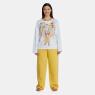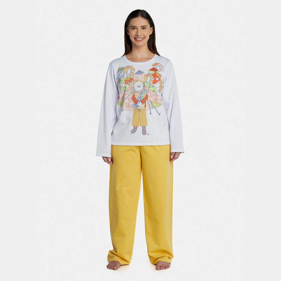 Conjunto pijama manga longa com estampa local e calça com tecido colorido liso, confeccionados em tecido moletinho peluciado 50% algodão e 50% poliéster.