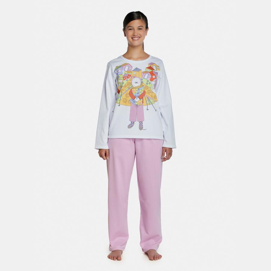Conjunto pijama manga longa com estampa local e calça com tecido colorido liso, confeccionados em tecido moletinho peluciado 50% algodão e 50% poliéster.