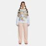 Conjunto pijama manga longa com estampa local e calça em tecido colorido liso, confeccionados em tecido plush 74% poliéster e 26% viscose.