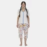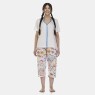 Conjunto pijama manga curta com abertura frontal, fechamento por botões e detalhe em viés e corsário com estampa corrida, confeccionados em tecido meia-malha 100% algodão.