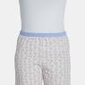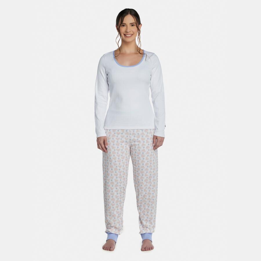Conjunto pijama manga longa com detalhe em viés na gola, em tecido liso canelado 98% algodão e 2% elastano, e calça com punho, em tecido com estampa corrida, confeccionada em moletinho peluciado 50% algodão e 50% poliéster.