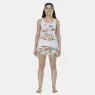 Conjunto pijama regata com estampa local e detalhe em viés e short com estampa corrida, confeccionados em tecido meia-malha 100% algodão.