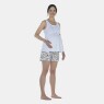 Conjunto pijama gestante regata em tecido liso com abertura frontal e fechamento por botões, detalhe em viés e elástico abaixo do busto, e short em tecido com estampa corrida, confeccionados em tecido meia-malha 100% algodão.