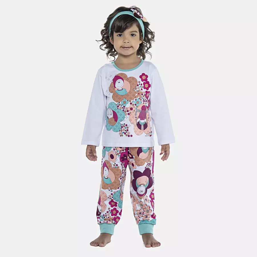 Conjunto pijama manga longa com estampa local, detalhe em viés e fechamento em tic-tac na gola para facilitar a vestibilidade, e calça com punhos e estampa corrida, confeccionados em tecido meia-malha 100% algodão.