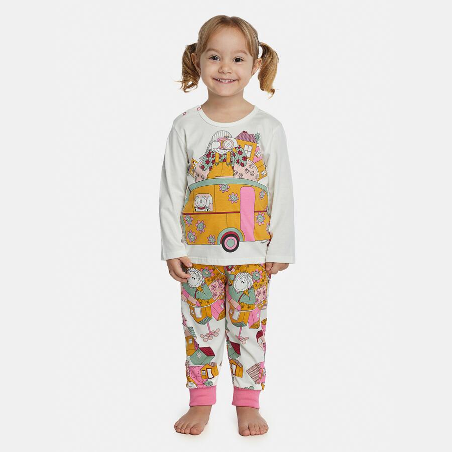 Conjunto pijama manga longa com estampa local, fechamento em tic-tac na gola para facilitar a vestibilidade e calça com estampa corrida e punhos, confeccionados em tecido meia-malha 100% algodão.
