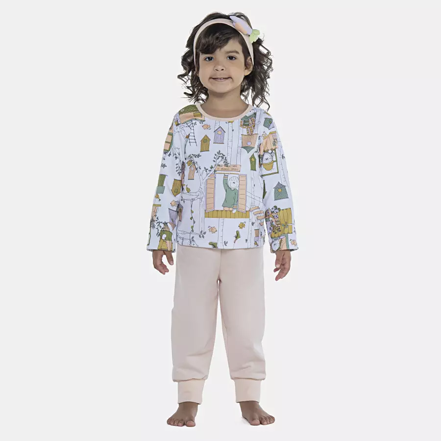 Conjunto pijama manga longa com estampa corrida e detalhe em viés no decote, fechamento em tic-tac na gola para facilitar a vestibilidade, e calça com punho em tecido colorido liso, confeccionados em moletinho peluciado 50% algodão e 50% poliéster.