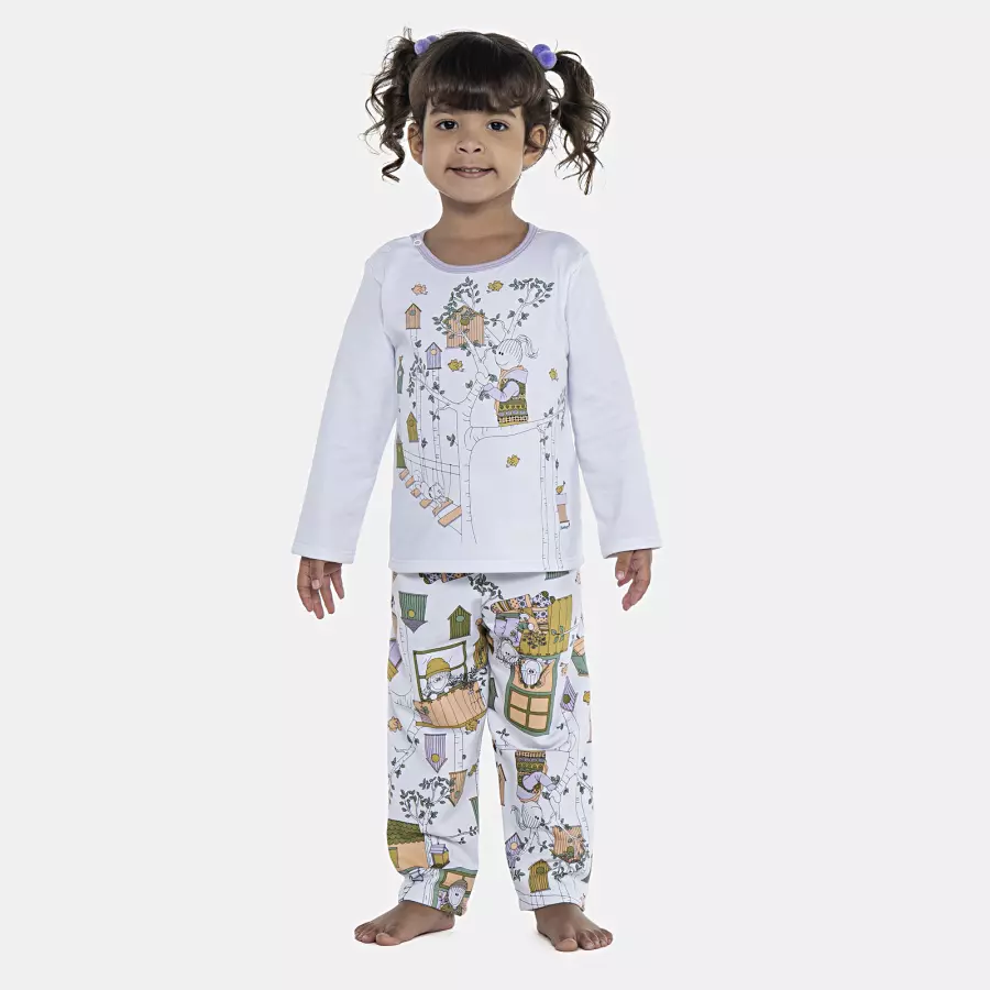 Conjunto pijama manga longa com estampa local, detalhe em viés no decote, fechamento em tic-tac na gola para facilitar a vestibilidade, e calça com estampa corrida, confeccionados em moletinho peluciado 50% algodão e 50% poliéster.