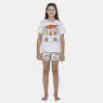 Conjunto pijama manga curta com estampa local na parte frontal com detalhe em viés no decote e short com estampa corrida, confeccionados em tecido meia-malha 100% algodão.