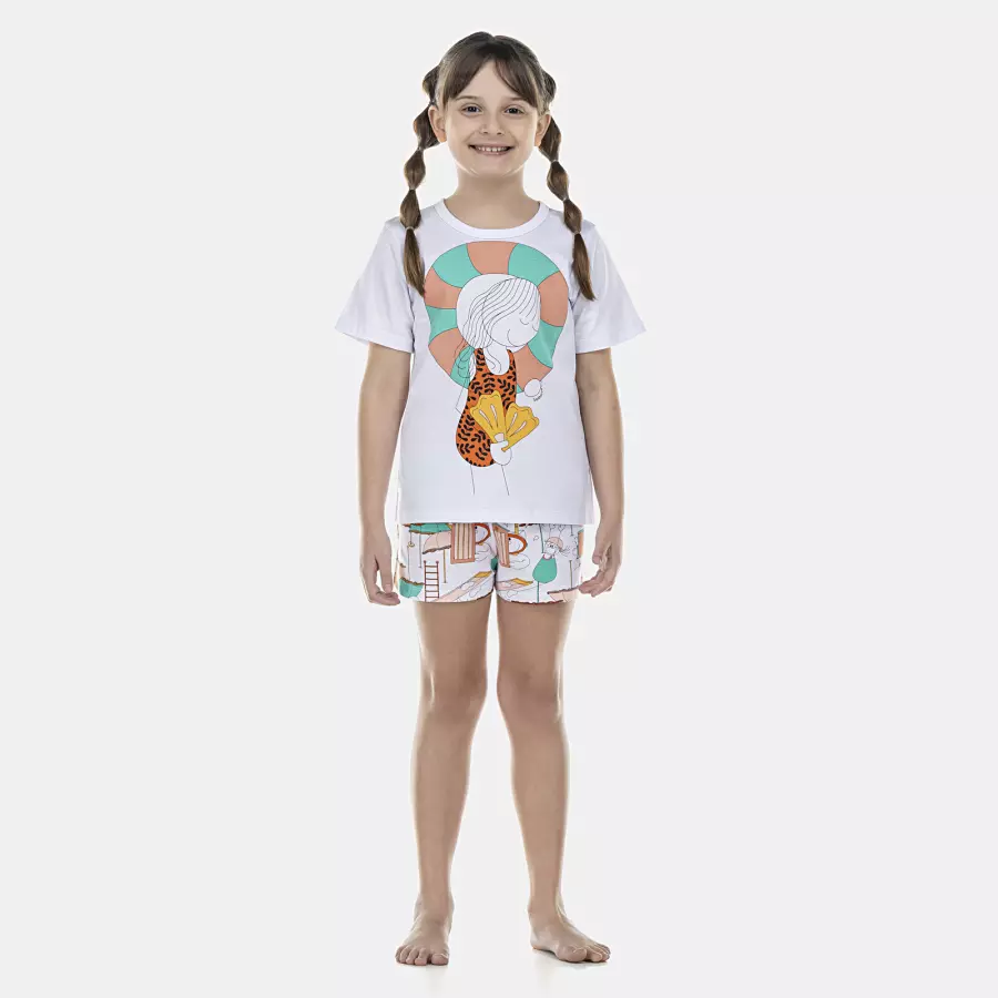 Conjunto pijama manga curta com estampa local na parte frontal e short com estampa corrida, confeccionados em tecido meia-malha 100% algodão.