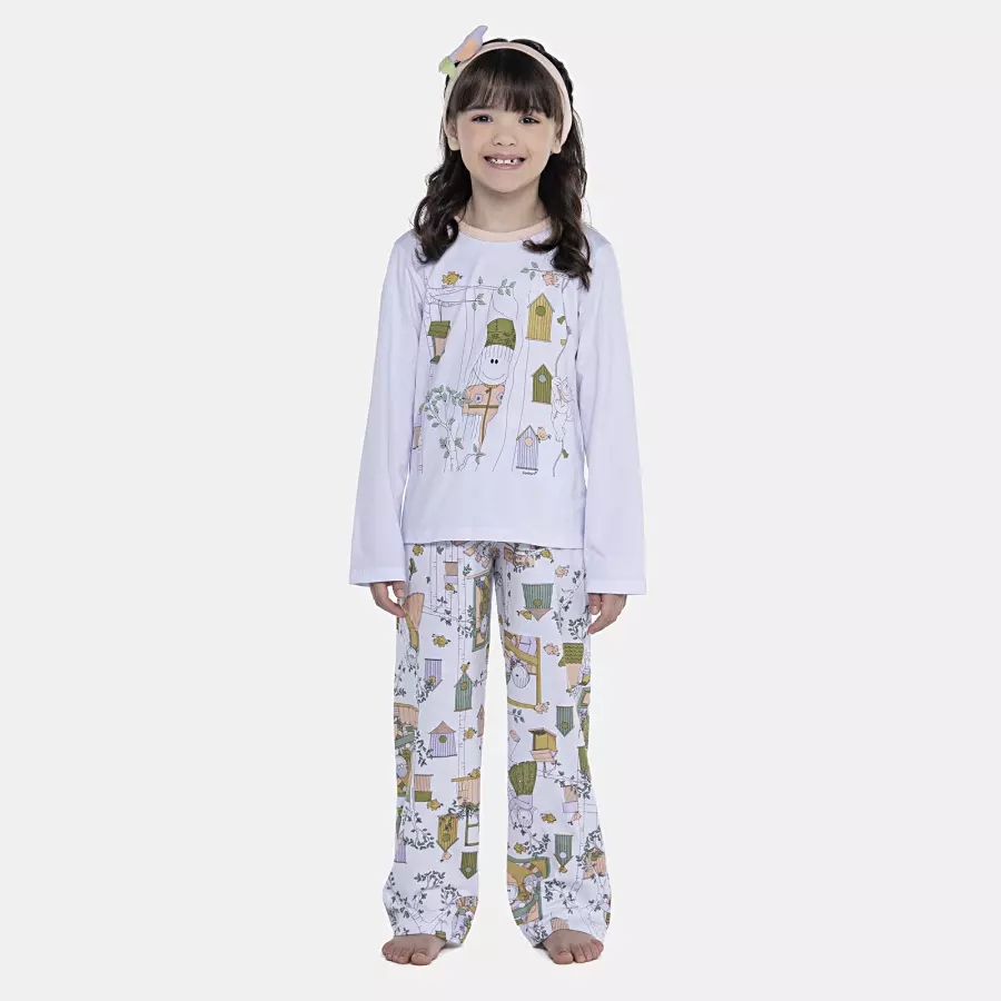 Conjunto pijama manga longa com estampa local e detalhe em alto relevo na estampa, acabamento em viés no decote e calça com estampa corrida, confeccionados em tecido meia-malha 100% algodão.