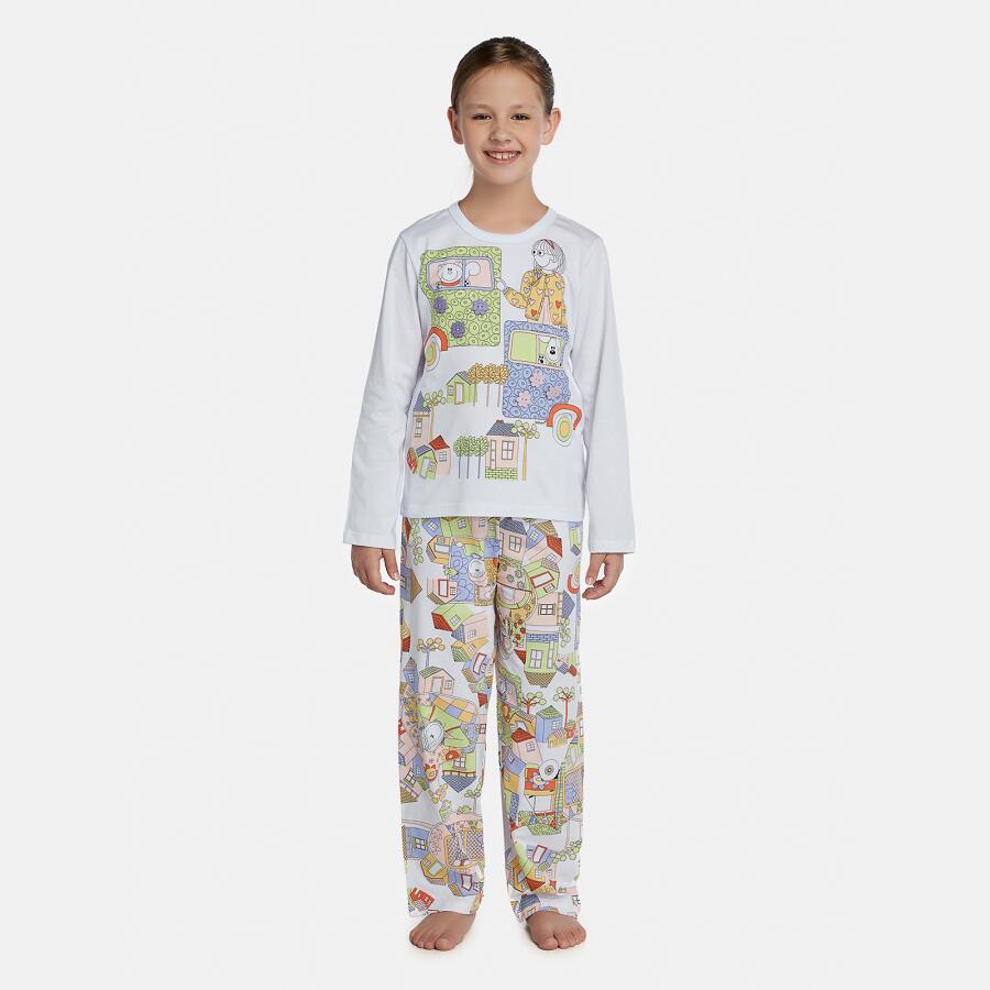 Conjunto pijama manga longa com estampa local com aplique em botões e calça com estampa corrida, confeccionados em tecido meia-malha 100% algodão.
