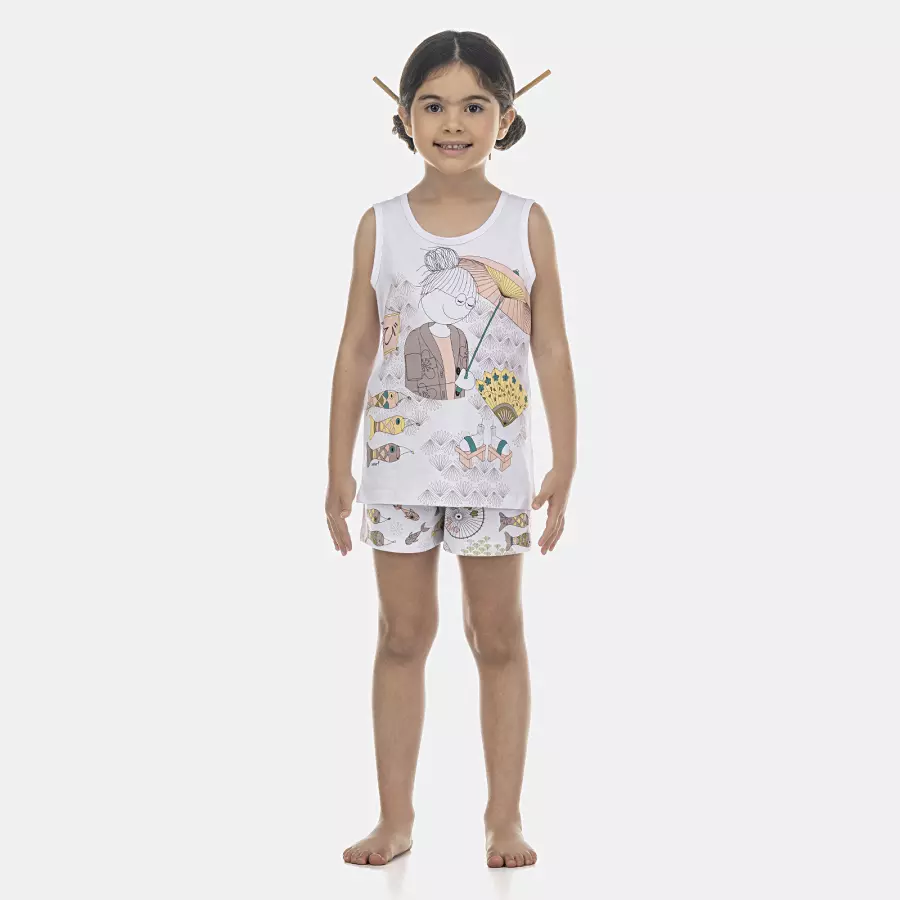 Conjunto pijama regata com estampa local e short com estampa corrida, confeccionados em tecido meia-malha 100% algodão.
