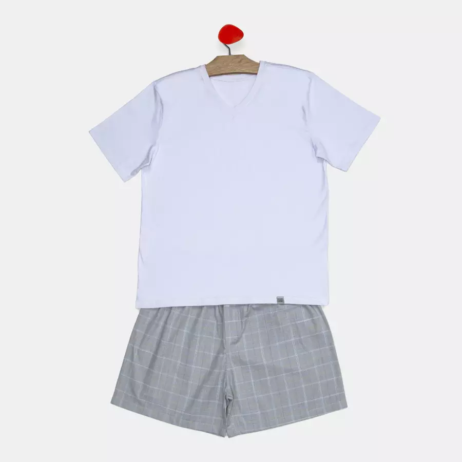 Conjunto pijama manga curta em tecido liso, com detalhe em viés na gola e decote em V, confeccionada em meia-malha 100% algodão e short em tecido xadrez tricoline 100% algodão.