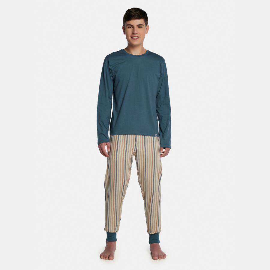 Conjunto pijama manga longa com detalhe em viés na gola e etiqueta, confeccionada em meia-malha 100% algodão e calça com punhos em tecido tricoline listrado 100% algodão.