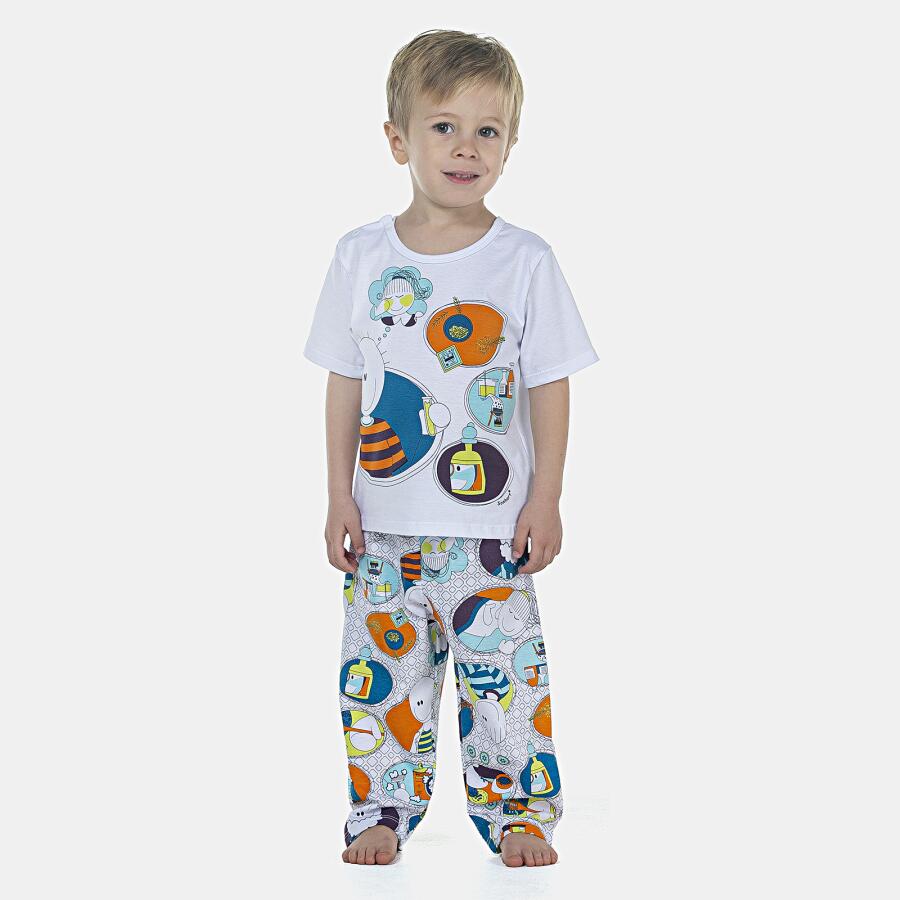 Conjunto pijama manga curta com estampa local, com detalhe em viés e fechamento em tic-tac na gola para facilitar a vestibilidade e calça com estampa corrida, confeccionados em tecido meia-malha 100% algodão.