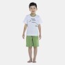 Conjunto pijama manga curta com estampa local e detalhe em viés na gola, e bermuda com tecido colorido liso, confeccionados em tecido meia-malha 100% algodão.