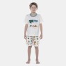 Conjunto pijama manga curta com estampa local e detalhe em viés e bermuda com estampa corrida, confeccionados em tecido meia-malha 100% algodão.