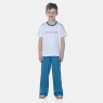 Conjunto pijama manga curta com estampa local, detalhe em viés na gola, e calça em tecido colorido liso, confeccionados em meia-malha 100% algodão.