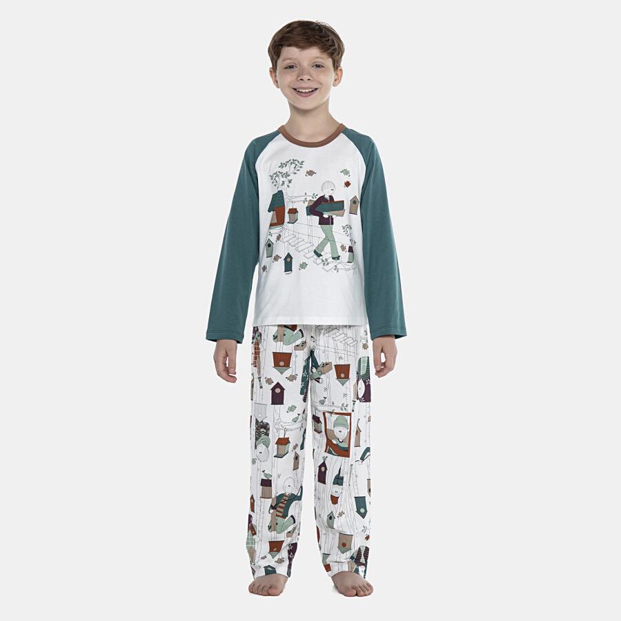 Conjunto pijama manga longa raglan com estampa localizada e detalhe em viés na gola, e calça com estampa corrida, confeccionados em meia-malha 100% algodão.