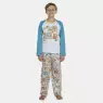 Conjunto pijama manga longa com estampa local e tecido colorido liso nas mangas, com detalhe em viés na gola e calça em tecido com estampa corrida, confeccionados em tecido meia-malha 100% algodão.