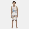 Conjunto pijama regata com estampa local e bermuda com estampa corrida, confeccionados em tecido meia-malha 100% algodão.