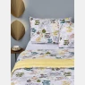 Edredom tamanho solteiro, sendo uma das faces em tecido com estampa corrida sem personagem, e a outra com tecido colorido liso, confeccionado em tecido meia-malha 100% algodão e enchimento 100% poliéster. Não acompanham outras fronhas avulsas, almofadas, lençol, boneco e outros acessórios expostos na imagem. Imagem meramente ilustrativa.