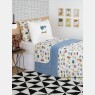 Edredom tamanho berço, sendo uma das faces em tecido com estampa corrida com personagem, e a outra em tecido colorido liso, confeccionado em tecido meia-malha 100% algodão e enchimento 100% poliéster. Não acompanham outras fronhas avulsas, almofadas, lençol, boneco e outros acessórios expostos na imagem. Imagem meramente ilustrativa.