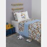Edredom tamanho casal, sendo uma das faces em tecido com estampa corrida com personagem, e a outra em tecido colorido liso, confeccionado em tecido meia-malha 100% algodão e enchimento 100% poliéster. Não acompanham outras fronhas avulsas, almofadas, lençol, boneco e outros acessórios expostos na imagem. Imagem meramente ilustrativa.
