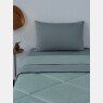Edredom tamanho solteiro, sendo uma das faces em tecido listrado e a outra em tecido colorido liso, confeccionado em tecido meia-malha 100% algodão e enchimento 100% poliéster. Não acompanham outras fronhas avulsas, almofadas, lençol, boneco e outros acessórios expostos na imagem. Imagem meramente ilustrativa.