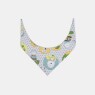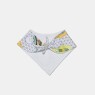 Babador com fechamento por amarração, sendo a frente confeccionada em tecido meia-malha 100% algodão estampada e o verso em tecido atoalhado (85% algodão / 15% poliéster).