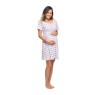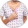 Camisola gestante manga curta com abertura frontal e fechamento por botões, parte superior com lastex e estampa corrida, confeccionada em tecido meia-malha 100% algodão.