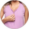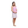 Camisola gestante regata com abertura frontal e fechamento por zíper, laço, parte superior em tecido liso e parte inferior/costas em tecido estampado, confeccionada em tecido meia-malha 100% algodão.