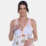Camisola gestante regata nadador, abertura por tict-tac para amamentação, com estampa corrida e franzido, confeccionada em tecido meia-malha 100% algodão.