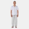 Pijama clássico manga curta aberta, com fechamento por botões, em tecido liso e calça em tecido colorido, confeccionados em tecido meia-malha 100% algodão.