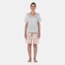 Pijama clássico manga curta, decote V, em tecido colorido, plaquinha metálica e bermuda com estampa corrida, confeccionados em tecido meia-malha 100% algodão.