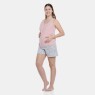 Conjunto gestante regata, com abertura por zíper, em tecido colorido cotton (96% algodão e 4% elastano) e short com estampa corrida, confeccionados em tecido meia-malha 100% algodão.